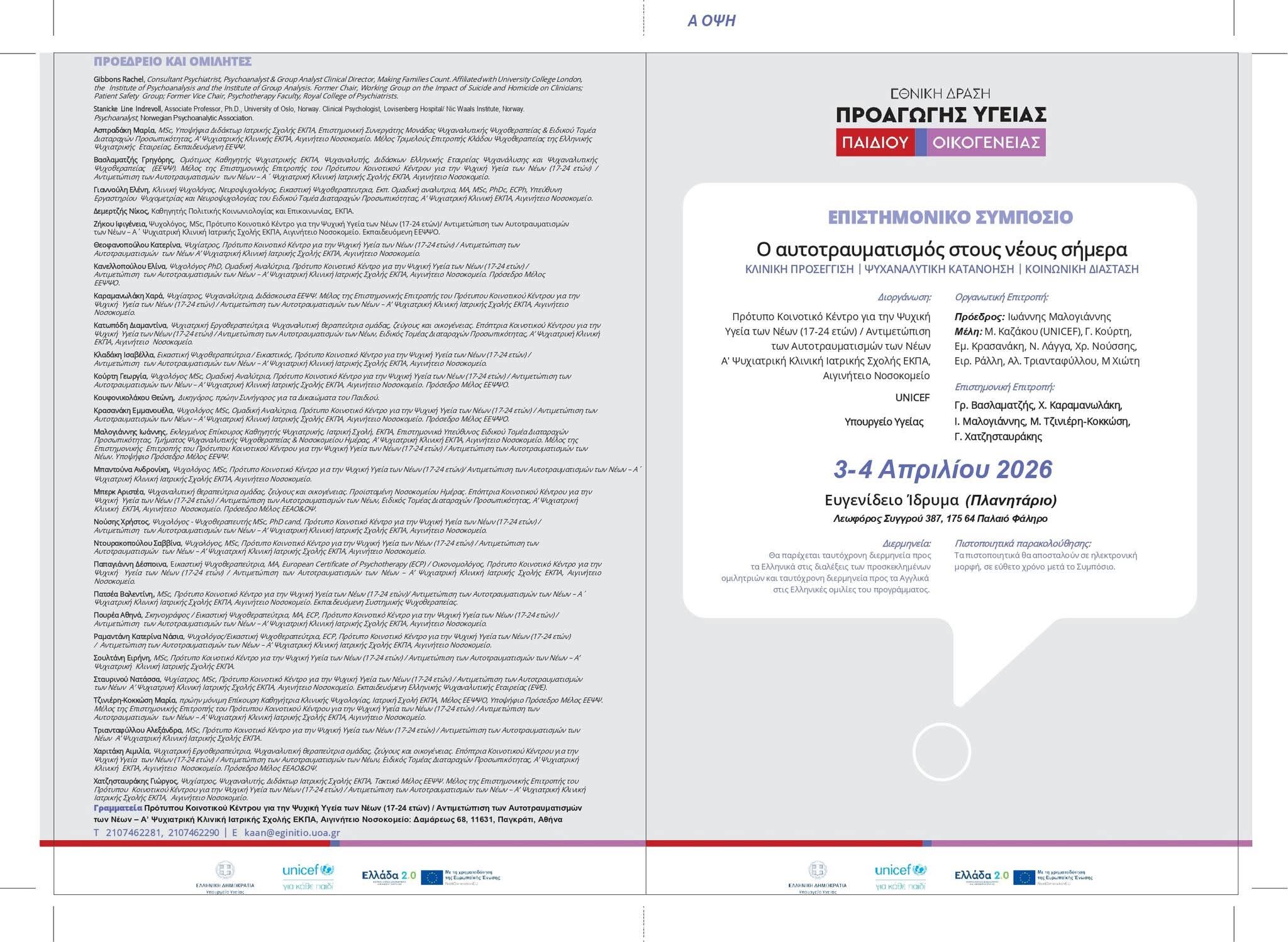 Στις 3 & 4 Απριλίου θα πραγματοποιηθεί το Επιστημονικό Συμπόσιο με θέμα: ” Οι αυτοτραυματισμοί στους νέους σήμερα, Κλινική προσέγγιση…