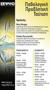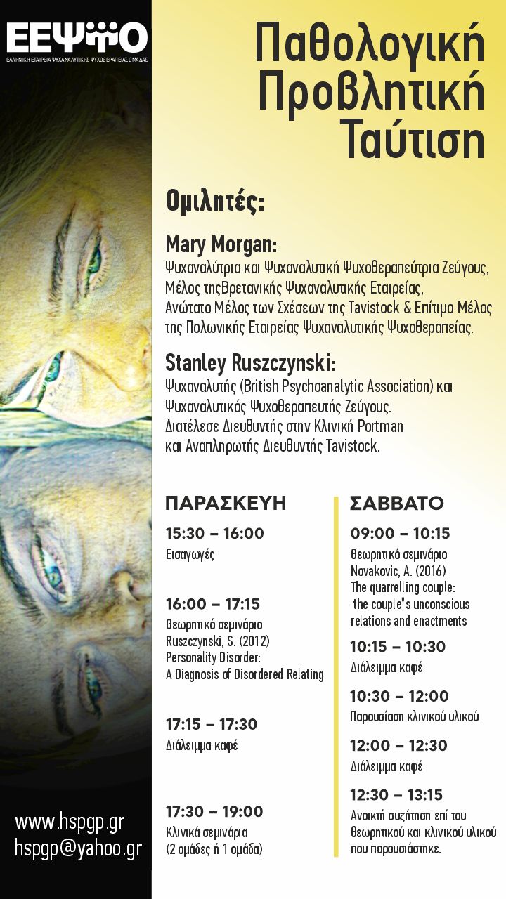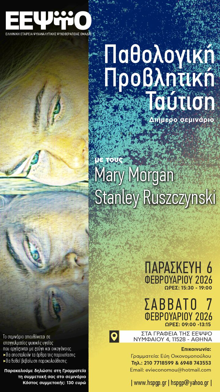 ΕΛΛΗΝΙΚΗ ΕΤΑΙΡΕΙΑ ΨΥΧΑΝΑΛΥΤΙΚΗΣ ΨΥΧΟΘΕΡΑΠΕΙΑΣ ΟΜΑΔΑΣ διοργανώνει διήμερο σεμινάριο με τίτλο Παθολογική προβλητική ταύτιση με τους Mary Morgan & Stanley Ruszczynski