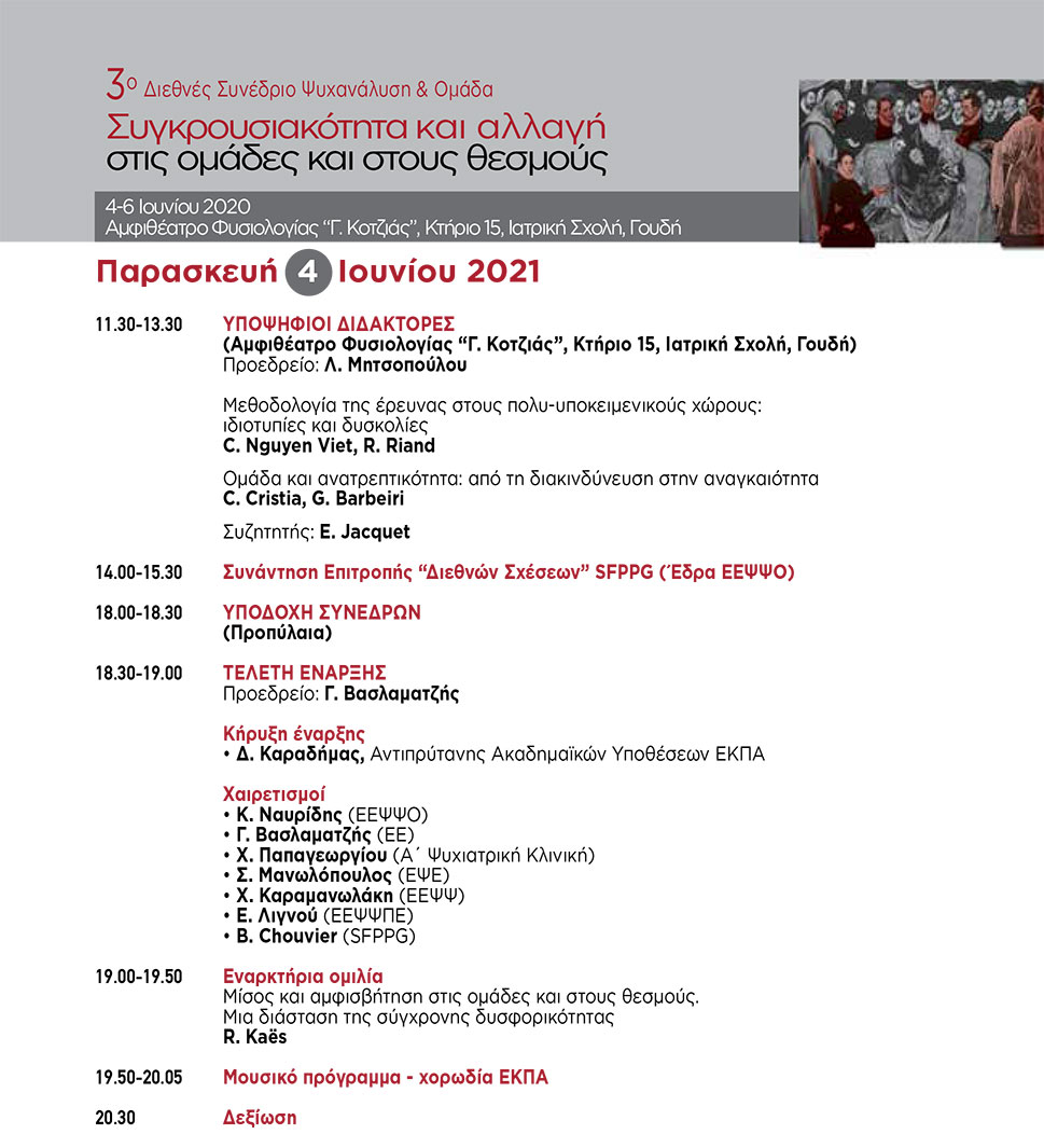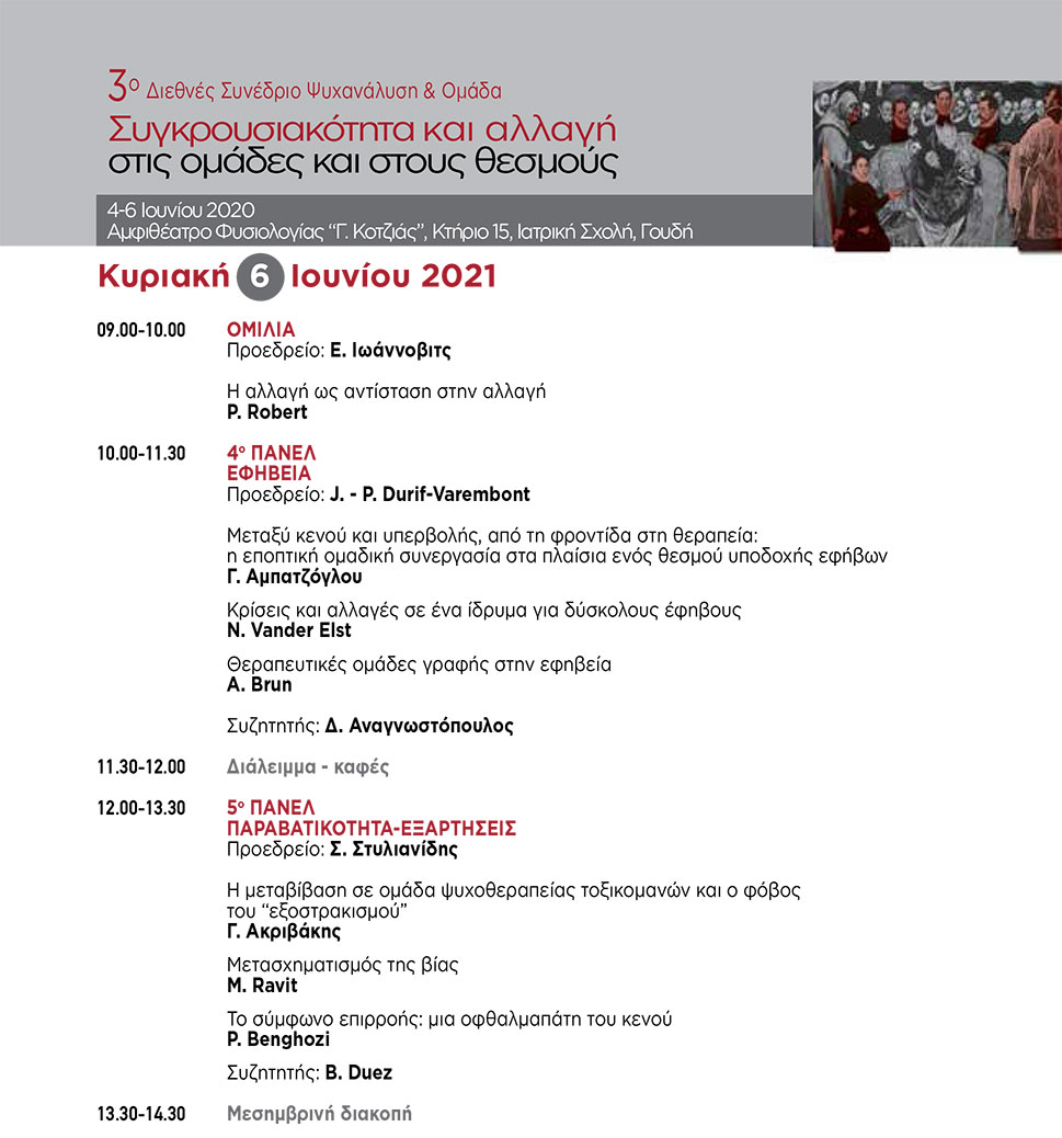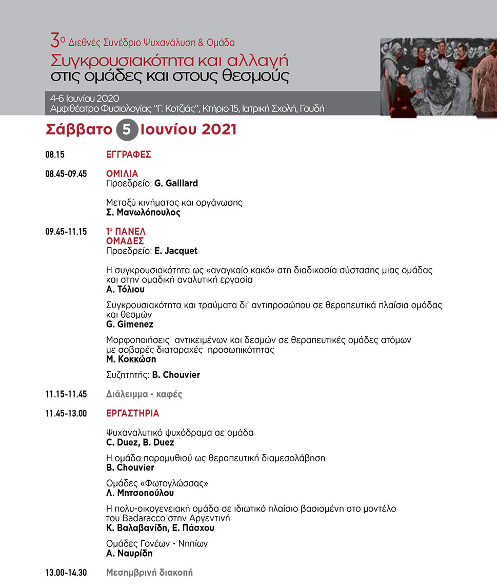 Η Ελληνική Εταιρεία Ψυχαναλυτικής Ψυχοθεραπείας Ομάδας (ΕΕΨΨΟ) διοργανώνει διήμερο βιωματικό σεμινάριο επιμόρφωσης στο ψυχαναλυτικό ψυχόδραμα ομάδας με τον Νικόλαο Τάκη στις 28 Φεβρουαρίου και 1η