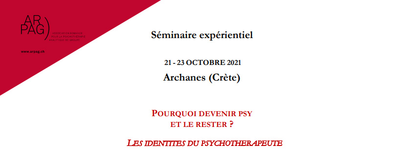 Η Ελβετική ARPAG διοργανώνει βιωματικό τριήμερο στις Αρχάνες, από 21-23 Οκτωβρίου 2021 στο πλαίσιο του οποίου θα πραγματοποιηθεί και η ομιλία του Κλήμη Ναυρίδη (προέδρου της ΕΕΨΨΟ) με θέμα: “Εσωτερικές ταυτότητες και ετερότητες του αναλυτή σε κατάσταση ομάδα”