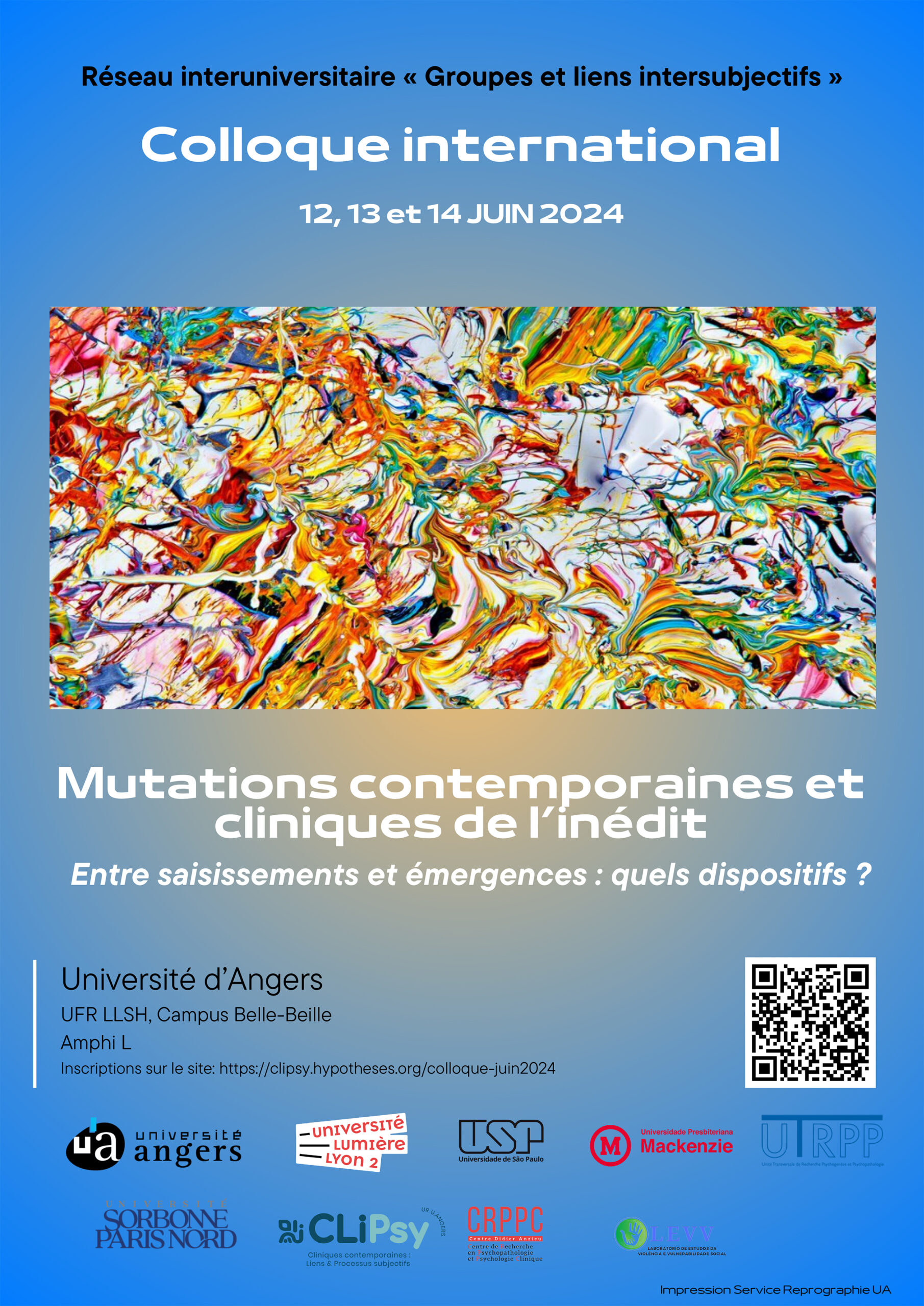 Ce colloque international d’envergure exceptionnelle se déroulera sous la présidence de Claudine Veuillet-Combier et Emmanuel Gratton, de l’UR. CLiPsy ( U. Angers), il est organisé par le réseau interunivesitaire « Groupes et liens intersubjectifs », présidé par Pablo Castanho (Université de Sao Paulo, BRÉSIL) et Lila Mitsopoulou (Université Lumière Lyon-2, FRANCE)